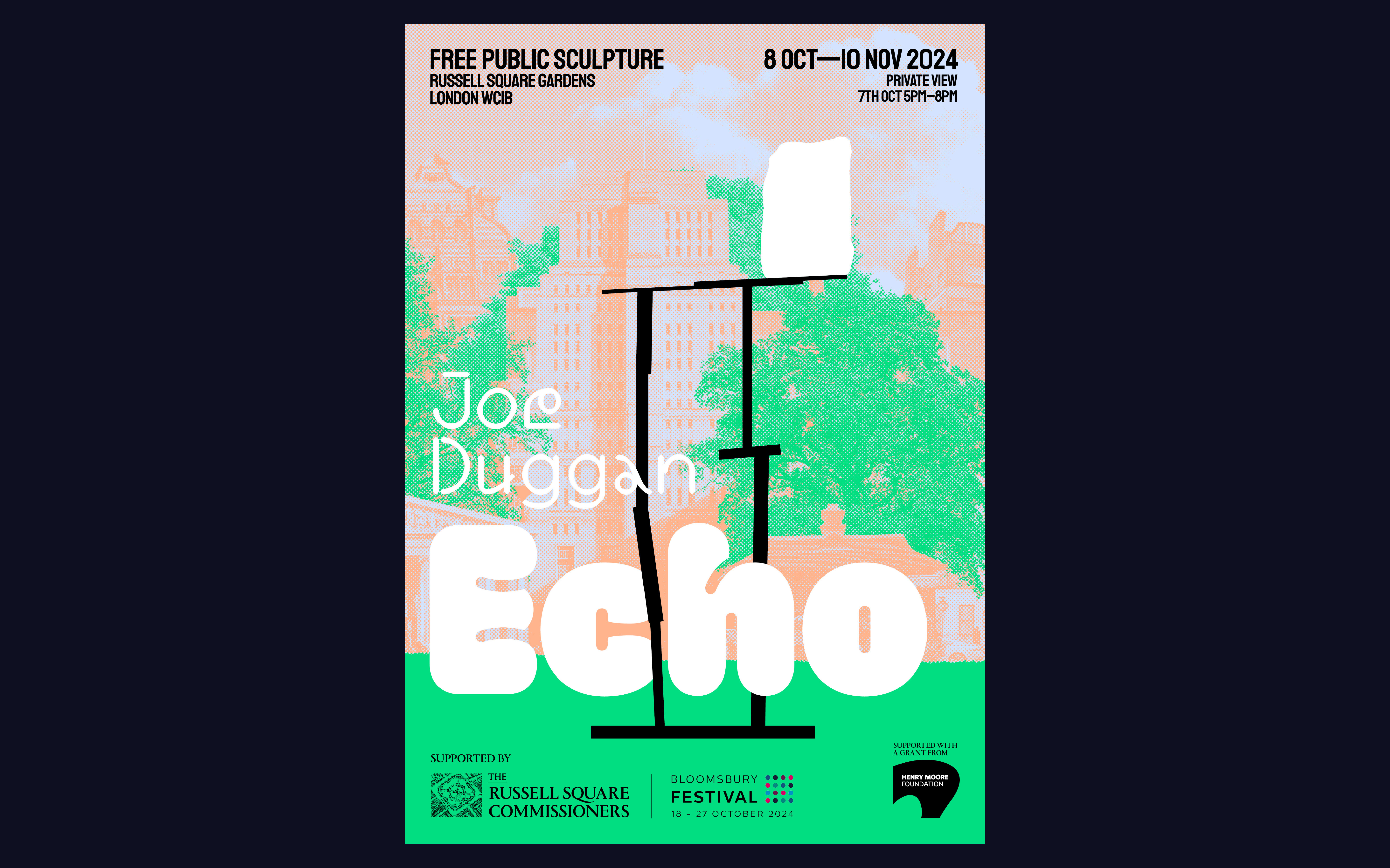 Promotional design and illustration for the inaugural Russell Square Sculpture Commission by artist Joe Duggan.